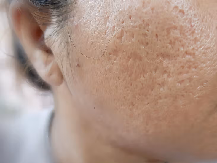 These look like small, deep pinpricks – like someone poked your skin with an ice pick. They happen when acne destroys tissue deep down. Fix: Lasers or punch excision fill them. Takes 3–6 sessions for smooth skin.